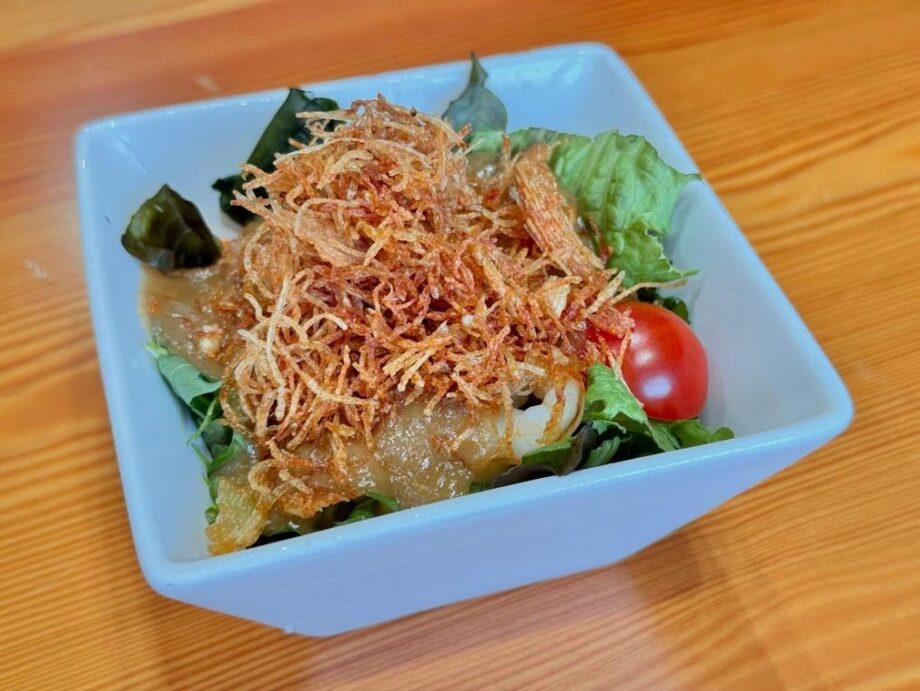 定食に添えられるサラダにかけられているのは、「横須賀野菜ドレッシング 特濃たまねぎ」です。ひと口食べると、まず玉ねぎのやさしい甘みがふわっと広がります。焦がし玉ねぎのコクに、みそのまろやかさが重なり、酸味は控えめ。野菜本来の味をそっと引き立ててくれるので、気づけば箸が止まらなくなります。