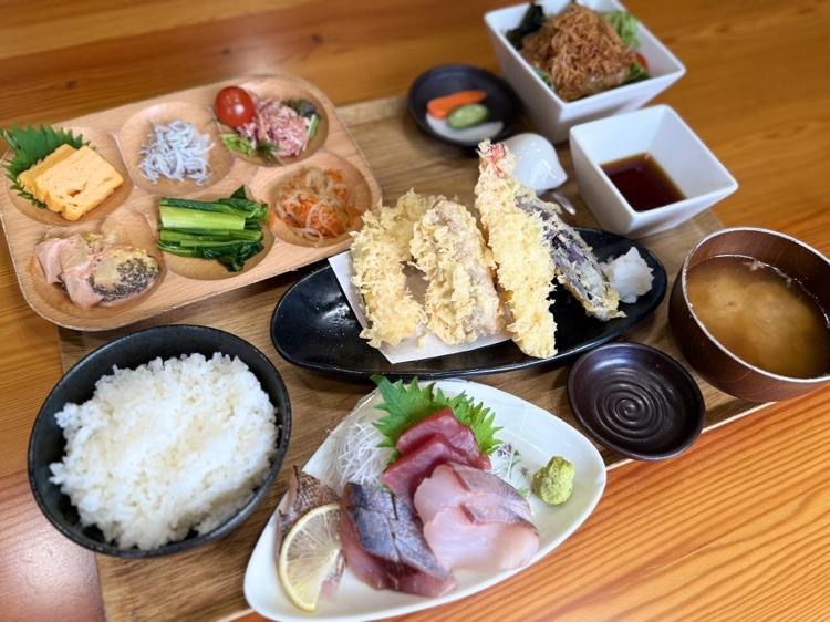 一番人気のうれしたのし屋定食(1,760円)は新鮮な刺身と天ぷら、6種小鉢、サラダがついた三浦半島の食材満載です。