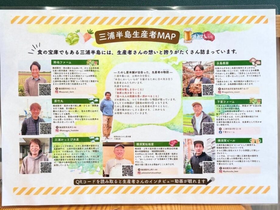 各テーブルにはメニューとともに「三浦半島生産者MAP」が用意されています。QRコードを読み取ると、生産者の声や想いを知ることができ、料理をより身近に感じられます。