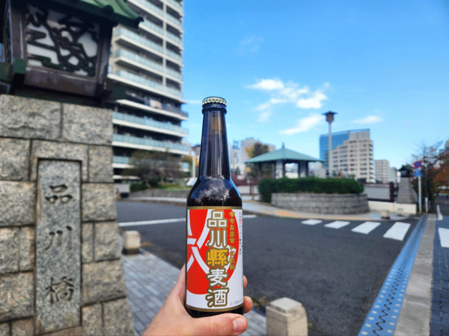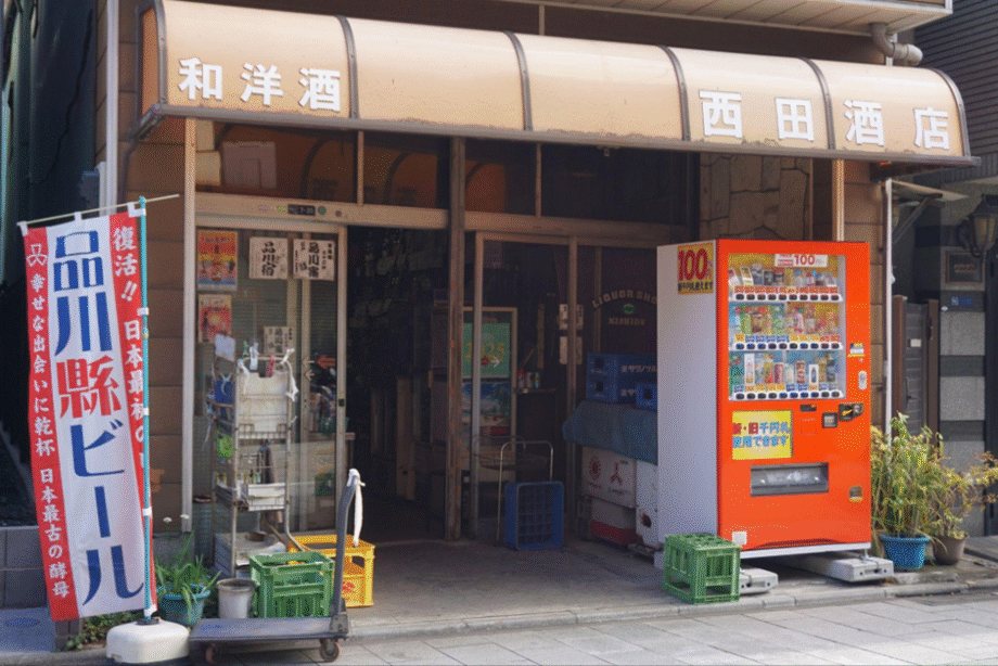 旅の終わりには、お土産を買うのが定番。品川宿とっておきのお土産があるとのことで、西田酒店に向かいました。 見つけたのは「品川縣(しながわけん)ビール」(税込633円)。
