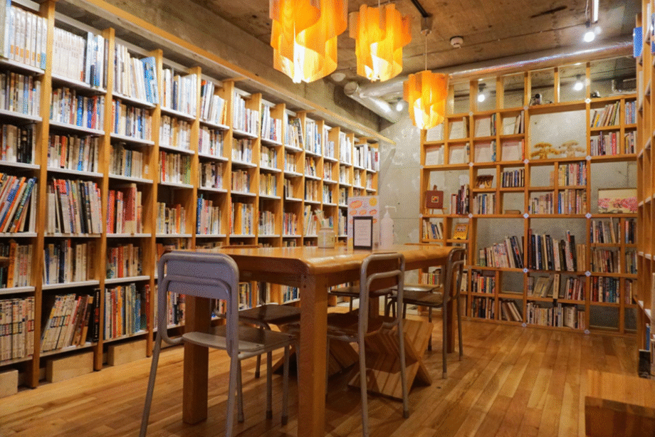 コンクリートがむき出しの無骨な階段をのぼっていくと、空気が一変。壁一面が本棚で、静かな空間が広がります。