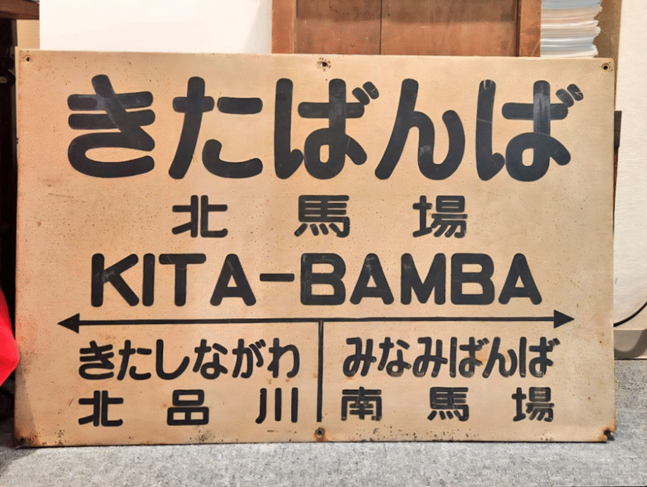 京急本線の駅でかつて使われていた駅看板も保存されています。「北馬場駅」と「南馬場駅」がくっついて現在の「新馬場駅」になったのだそう。当時のまま残っているビス穴に時代を感じます。