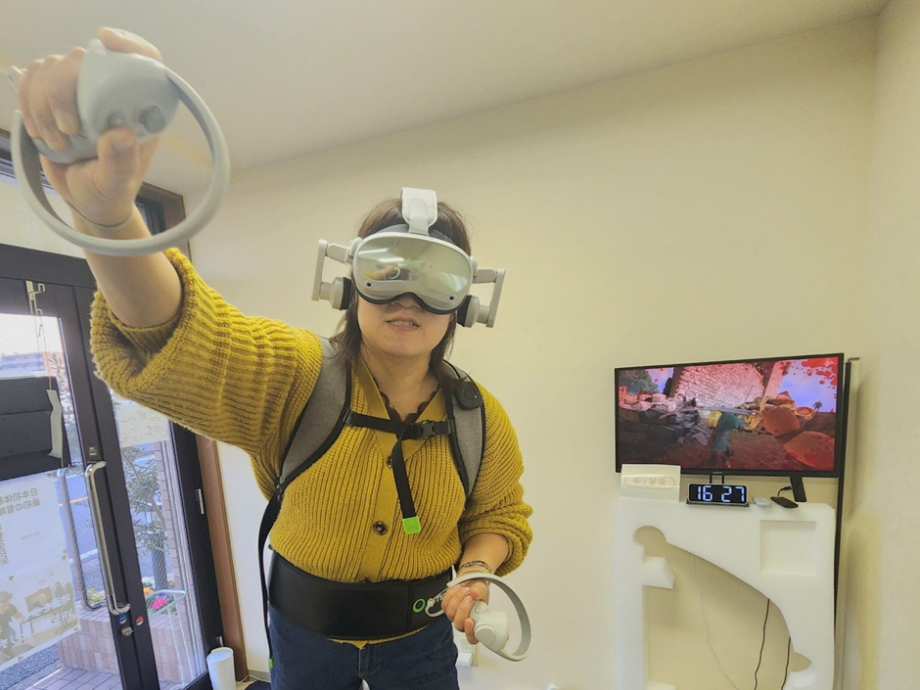 室内にはモニターがあり、ゲームをしている人と同じ景色を見られるとのこと。また、体験中でもまわりの人との会話が可能です。