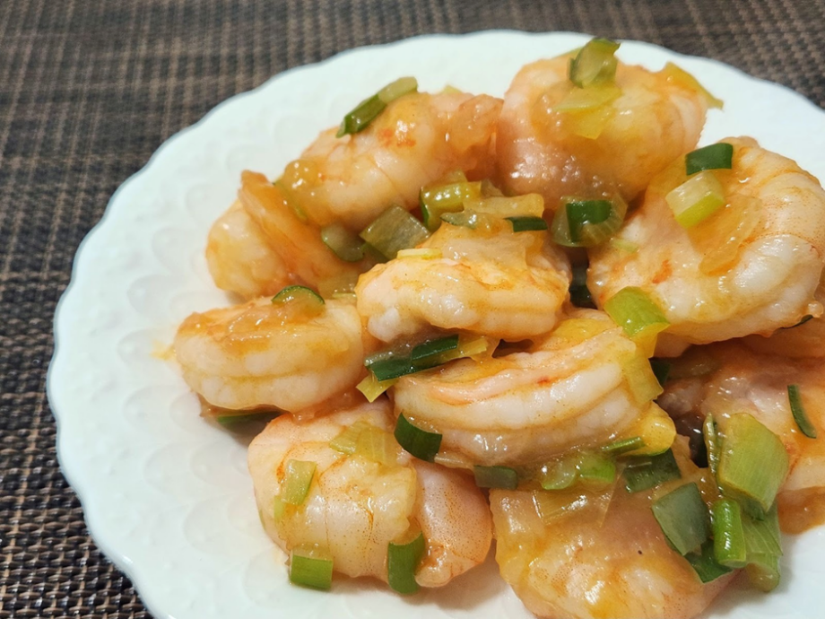 ハバネロケチャップに水を加えて好みの辛さに調整したら、片栗粉をつけて焼いたエビとネギのみじん切りを入れるだけという手軽さです。