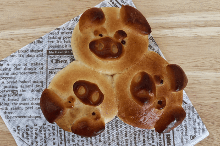 「こちらのパンも人気なんです」と店主に紹介されたのが、テレビで取り上げられた”三色の子豚パン”。三匹の顔が可愛らしいこのパンは、お昼過ぎに立ち寄った時にはすでにラスト1。人気の高さがうかがえます。