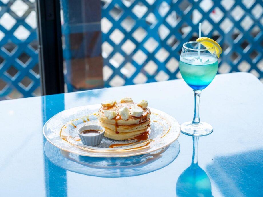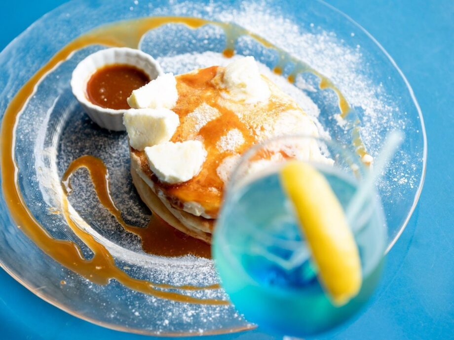 特製塩バターでいただくパンケーキは、海岸を見渡しながら甘じょっぱさを感じられるメニューです。
