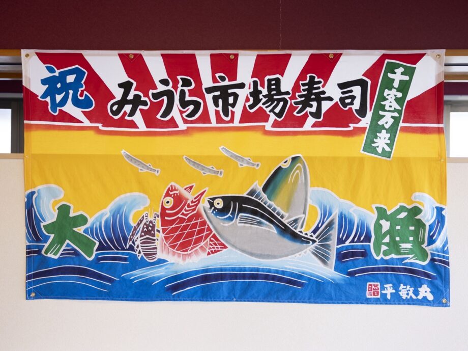 大漁旗に描かれているのは三崎マグロをはじめ地元で獲れるものばかり。賑わう店舗の中で、子どもたちが競い合って魚の名前を当てていく声が聞こえてきそうです。