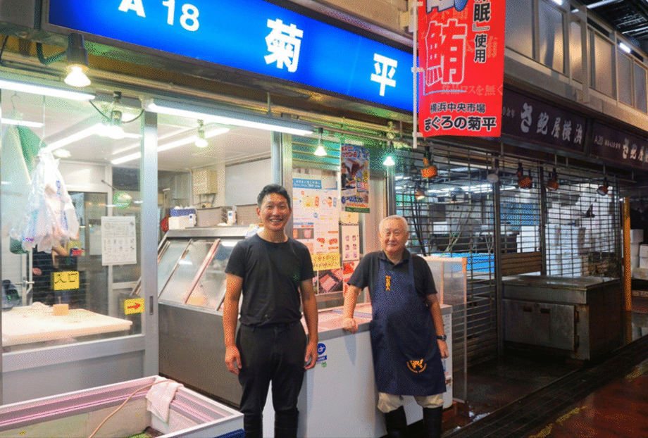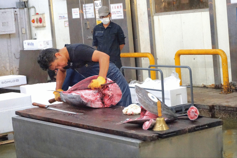マグロの解体ショーを担当している尾田さん(写真左)