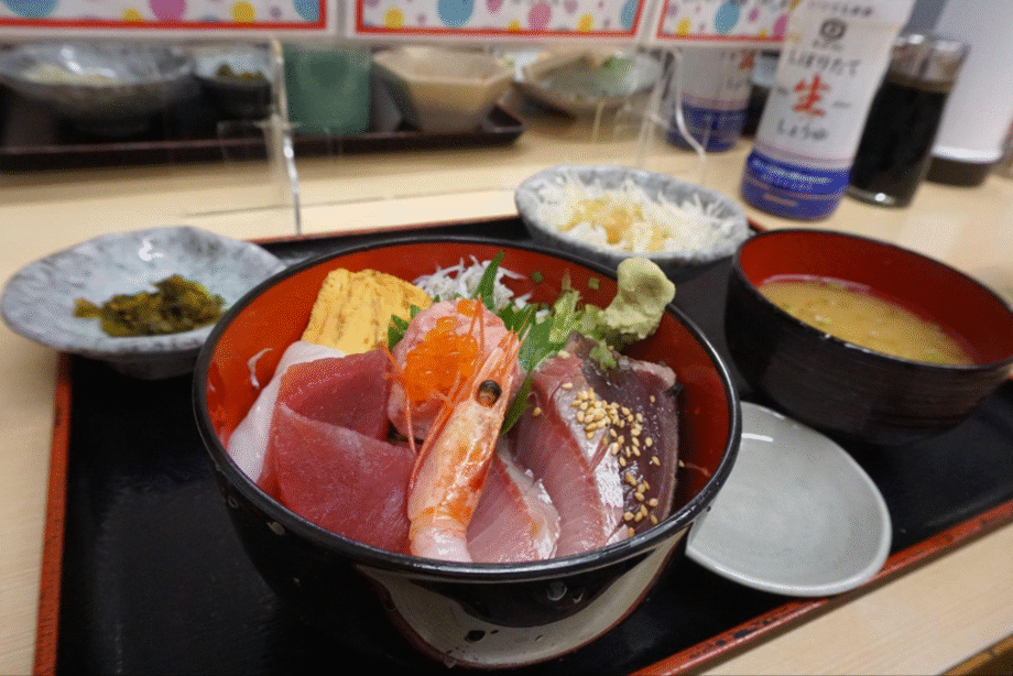 この日の具材は、甘エビ、マグロ、ネギトロ、ぶり、かつお、イカ、釜揚げしらす、いくらでした。当日の朝に仕入れた新鮮な魚で作るので、内容は変わることもあるそうです。それにしても、豪華な海鮮丼!