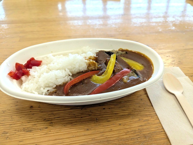 ゴロっと大きめの地元「はまポーク」のお肉は口の中にいれると、ほろっとほどける柔らかさ。カレーの上にナスやパプリカものっていて、見た目にも楽しめる一品です。