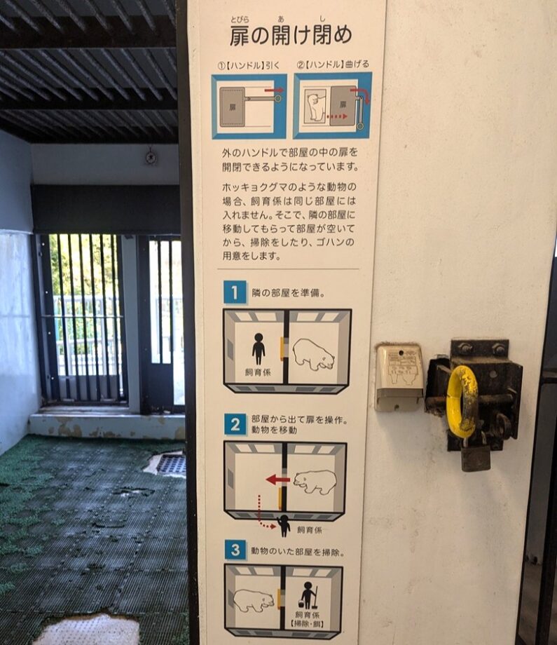 頑丈な扉やカギを見たり、扉の開閉ルールを知ったりしていくうちに、飼育員の仕事を身近に感じられる貴重な展示です。