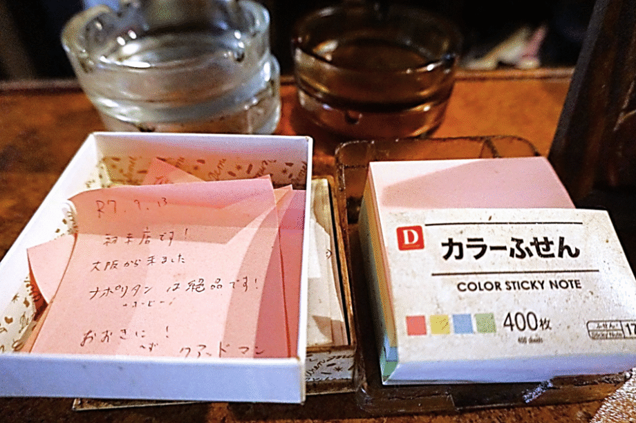 スマホを持たないマスターは、カウンター席でのおしゃべりか、店内に置かれた付箋での交流が基本。あまりおしゃべりが得意ではないという方は、この付箋に感想を書いていくと、マスターにきっとその思いが伝わります。