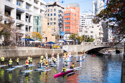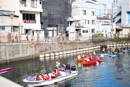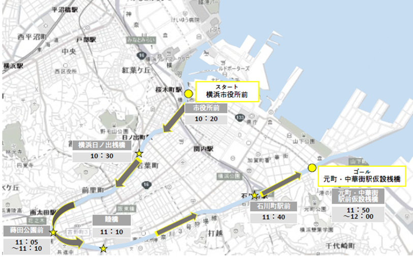 プレジャーボートや観光船、SUP、カヌーやEボートなどが船団を組み、運河で水上パレードを行います。10時20分に横浜市庁舎前をスタートする船団とSUPなど非動力船が大岡川日ノ出町を経て、蒔田公園から中村川に入り元町・中華街 駅前仮設桟橋に到るルートを進みます。非動力船は、スタートから蒔田公園までがGOALとなります。