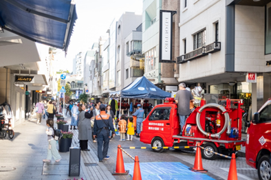 横浜元町ショッピングストリートの防災ブースでは、実際にオレンジ色の浮き輪を投げる体験やAED・心肺蘇生法の体験、ミニ消防車との写真撮影ができます。命を守る方法をご家族皆様で楽しみながら学びませんか。