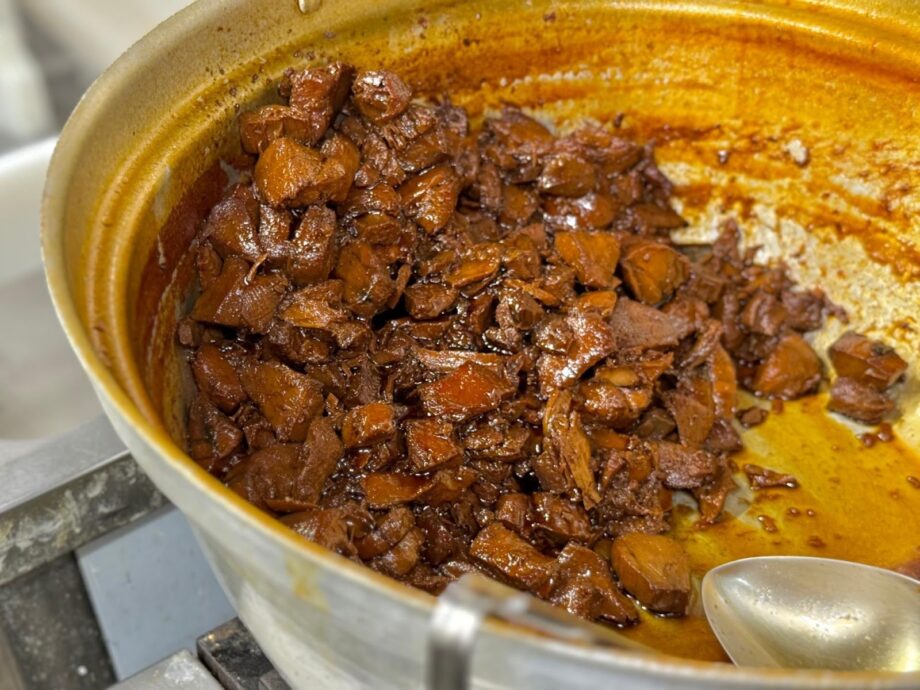 大きな鍋で煮詰められた深い飴色の「まぐろ角煮」。丁寧に下処理をしたマグロを約3時間かけて丁寧に煮詰めていきます。