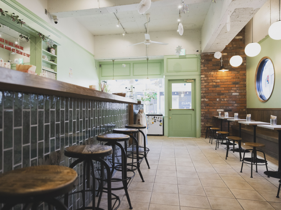 壁際には温もりのある木のベンチが設えられ、間の通路もベビーカーが難なく通れるほどに広々。日中や休日は家族連れが、夕方からは大人たちが、アイスと“会話”を求めて訪れます。