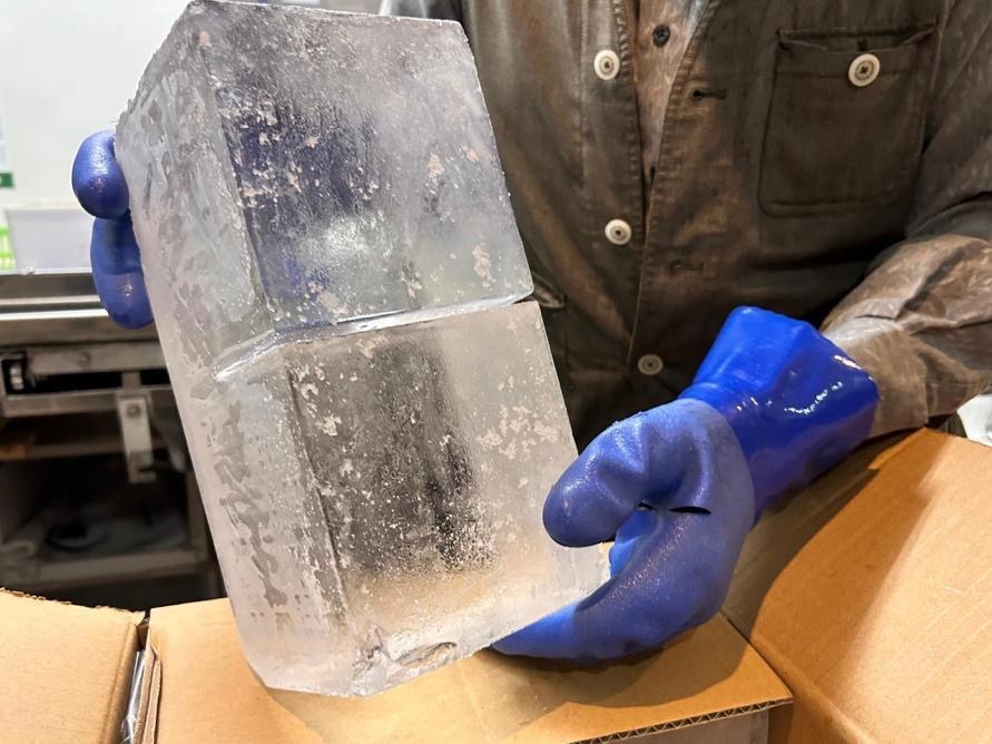 ブロックで納品される氷にも、ひと手間を加えています。それは、納品時にあらかじめ氷に切れ目を入れておくという配慮。この切れ目があることで、店のスタッフは大きな氷の塊を安全かつスムーズに砕くことができます。
