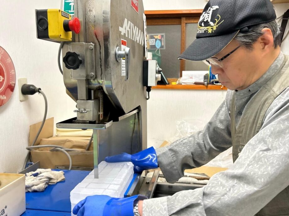 1貫(約3.75キログラム)の大きな角氷を注文のサイズにカットして納品します。