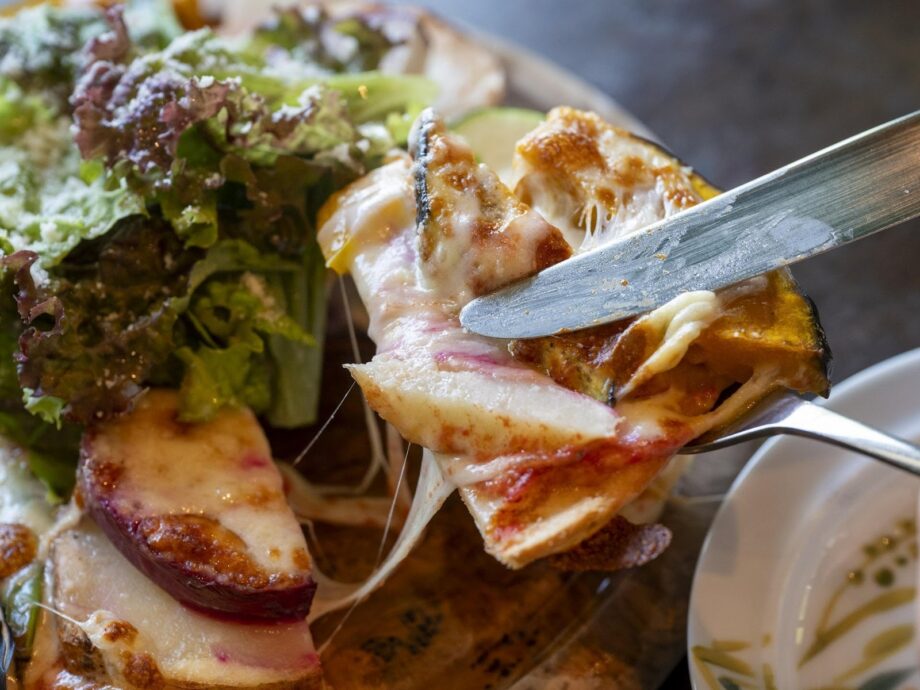 この日は、ズッキーニ、ナス、パプリカ、インゲン、カボチャ、ダイコン2種。塩やこしょうは使わず、トマトソースとモッツアレラチーズ+パルメジャーノチーズの塩味とオーブン調理だけで、野菜そのものの味を引き出しているのが特徴です。