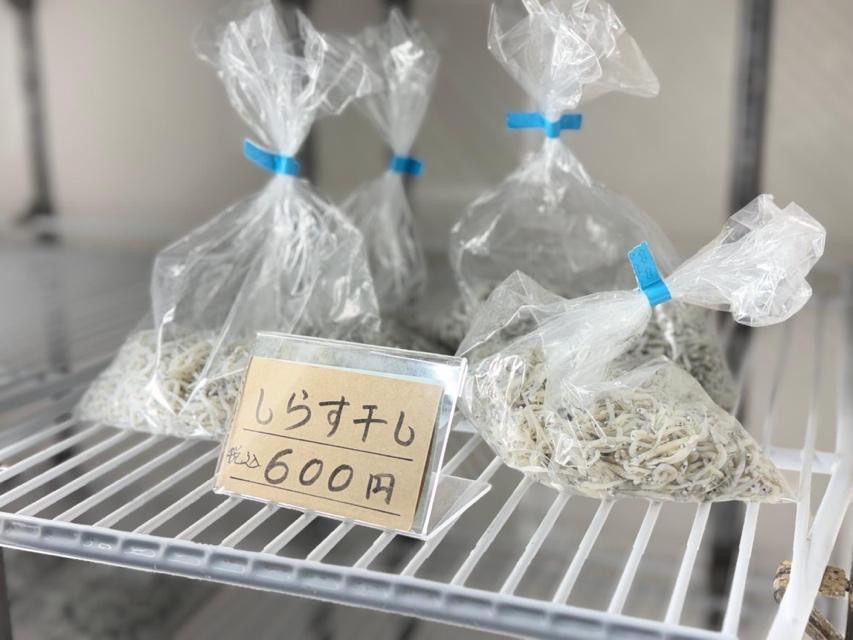 釜揚げしらす(小 600円・大 1,200円)、しらす干し(600円)、自家製佃煮(650円)など、しらす直売所で販売中です。地方発送も可能です。