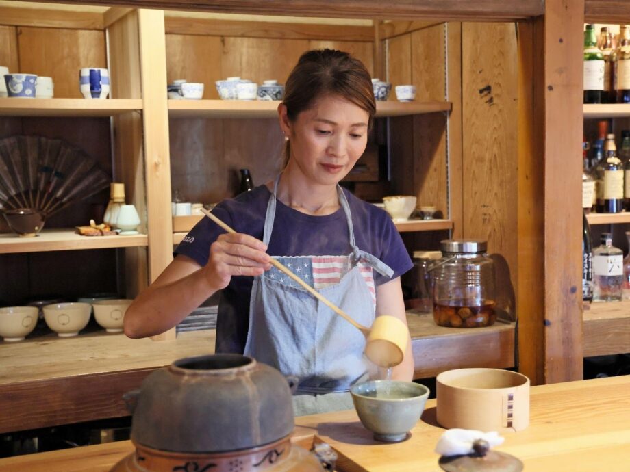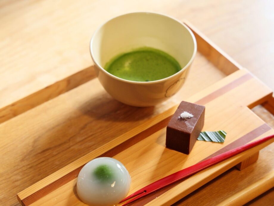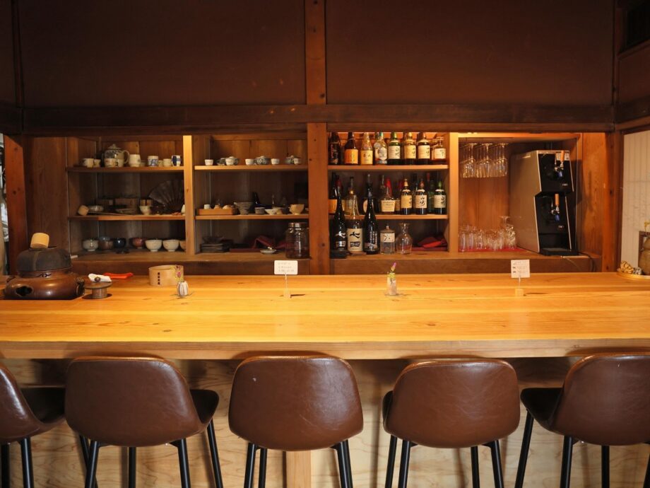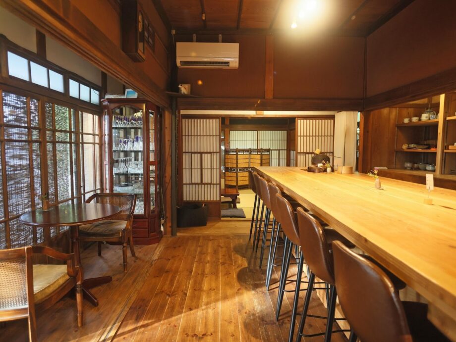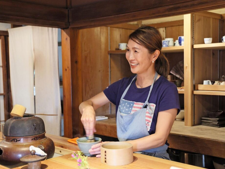 趣ある古民家のカウンターで、茶釜の湯で点てる本格抹茶と自家製和菓子をいただく贅沢なひととき。