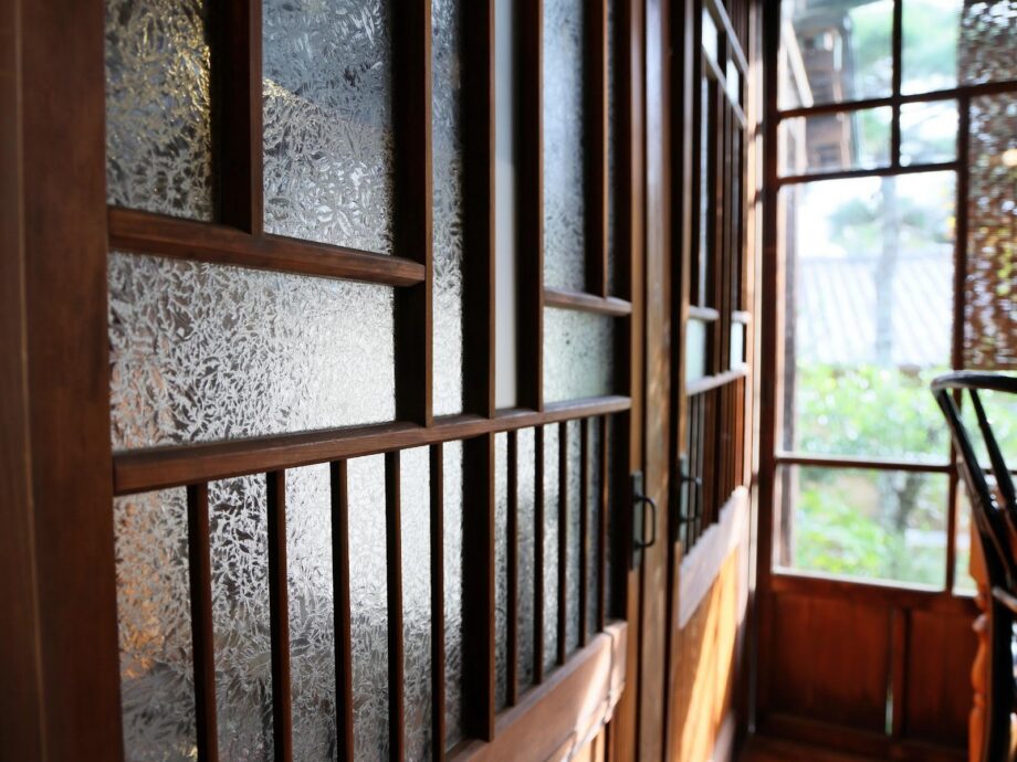 玄関の破魔矢の欄間をはじめ、模様や色の入ったガラスを使った建具、和室の黒い壁、ほこりがたまらないよう斜めに切ってある障子の桟(さん)など、建築当時のままの良さが活かされた、見どころがたくさん。