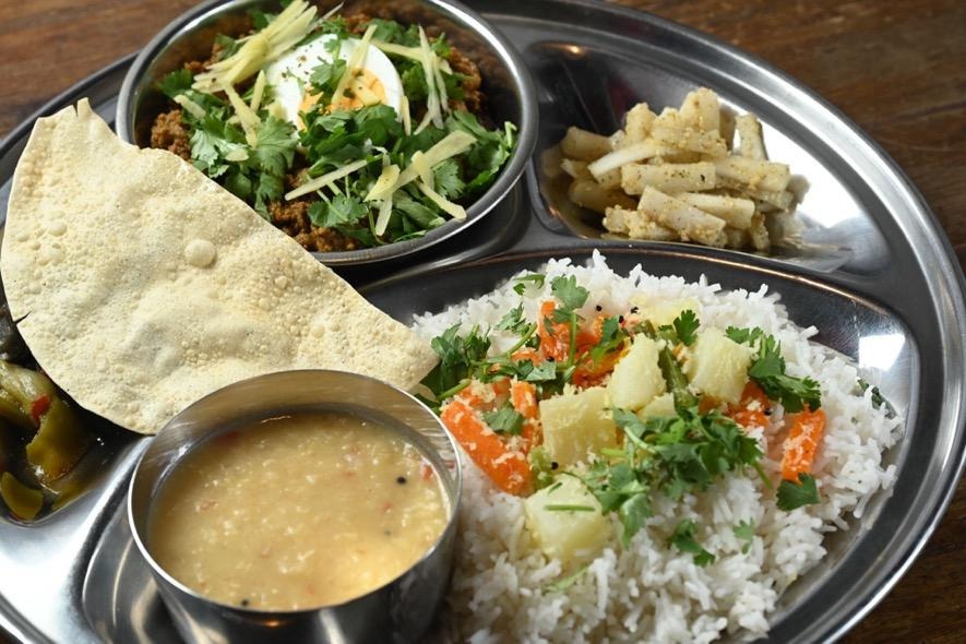 カレーのメニューは常時2種類から選べ、時々週がわりのメニューが登場。入門編として味わうならばマイルドな辛さの「バターチキンカレー」がおすすめですが、それとまったく表情の異なる味わいのキーマカレー「マトンひき肉とネパール山椒」(1,760円)もファンが多い逸品です。