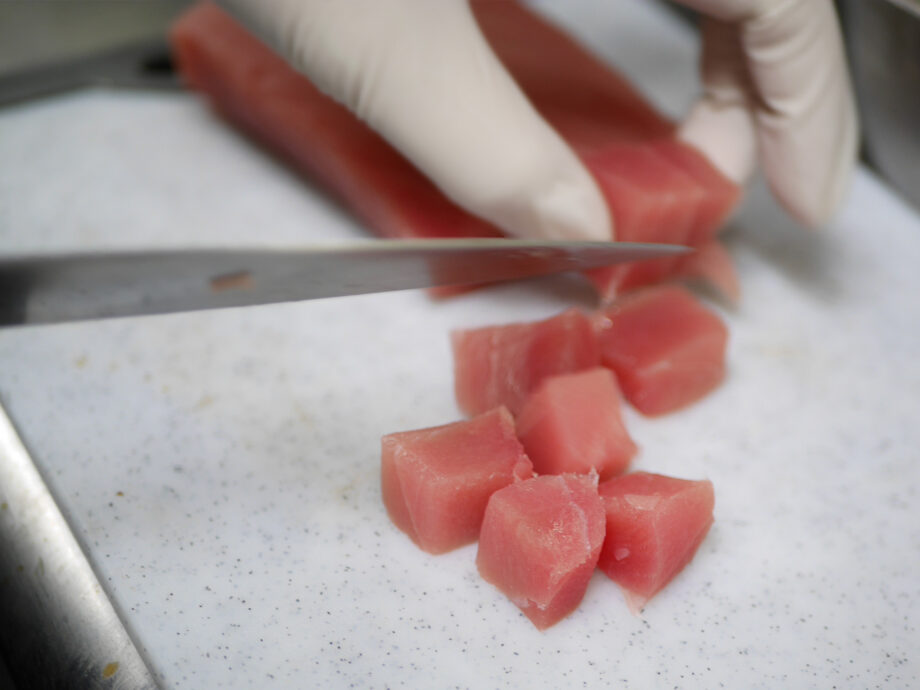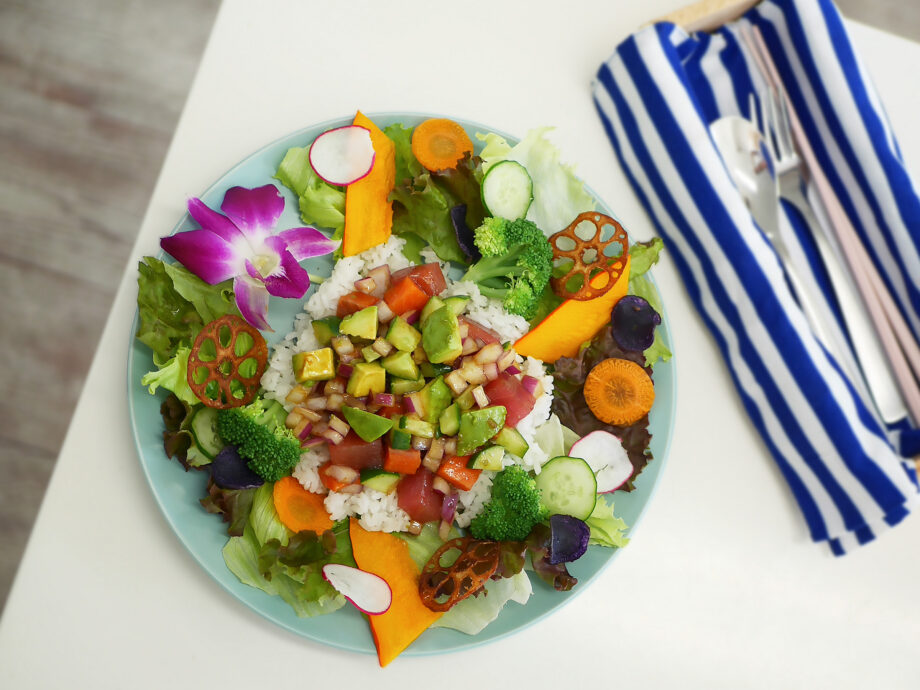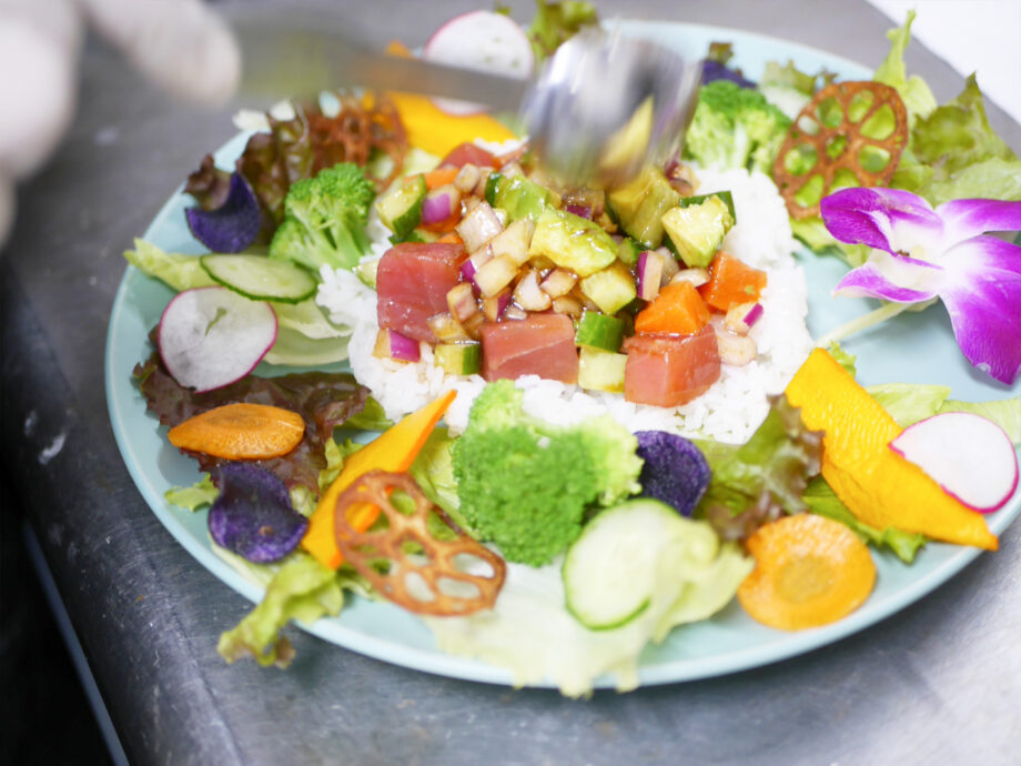 味の決め手は、智子さんが試作を重ねて完成させた自家製ポキソース、ハワイ島での味です。醤油ベースにごま油のコク、レモンやジンジャーの爽やかさを加え、玉ねぎで旨みと香りを引き立てました。コクがありながらさっぱりとした味わいは、魚と野菜の個性を絶妙にまとめます。