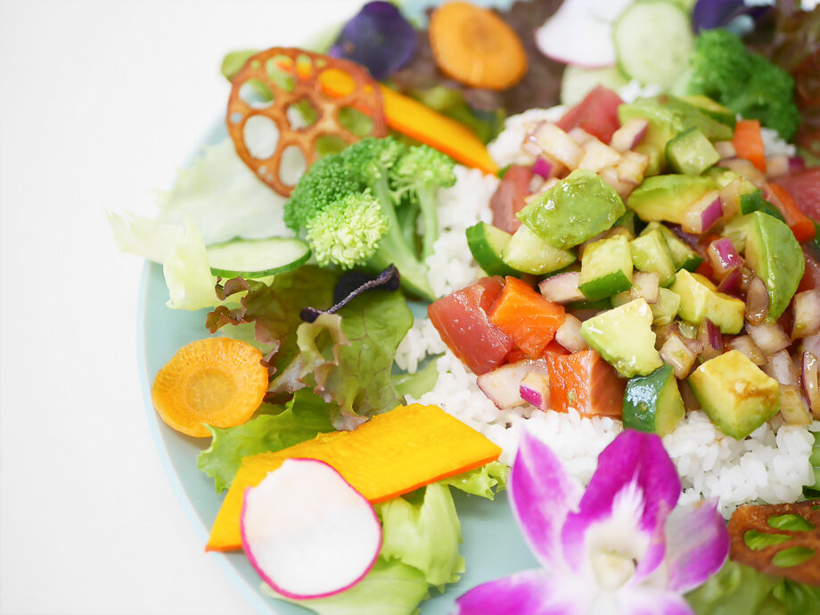 魚は主に三崎港から仕入れる新鮮なマグロとサーモン。そこにアボカドや三浦・鎌倉野菜をふんだんに使い、素揚げやカットを工夫して多彩な食感と彩りを与えています。