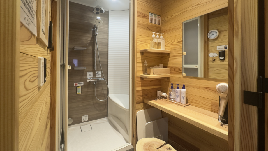個室シャワールームはスチームサウナも完備。ドライサウナと比べて低温かつ潤うため、肌や髪がつやつやになると好評です。