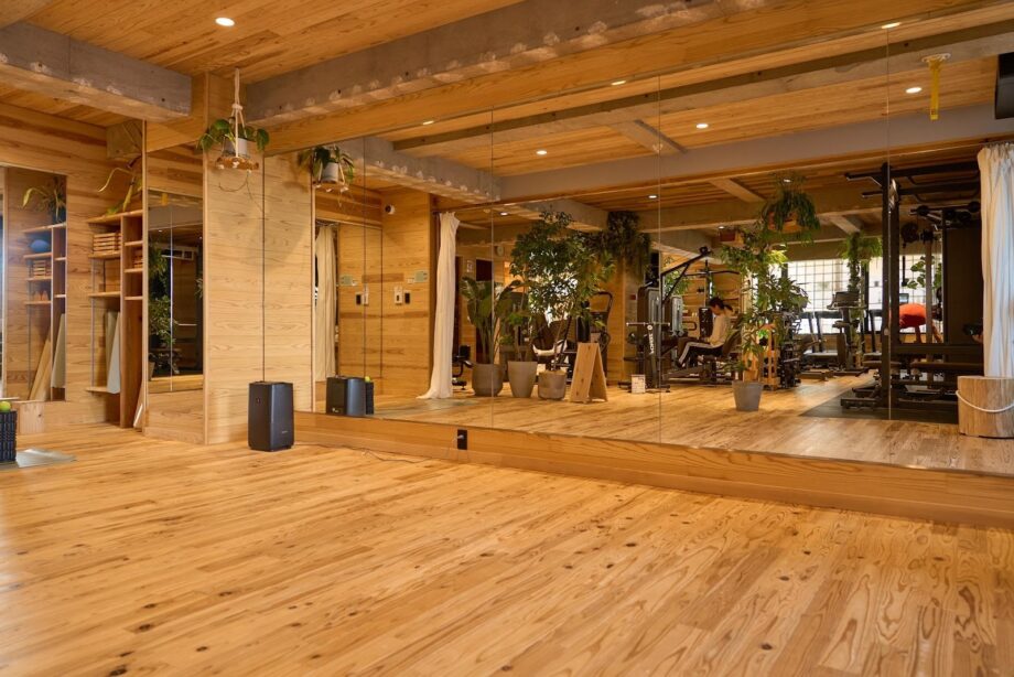 木と緑に囲まれた内装は国産の無垢材で仕上げられ、生きた植物もふんだんに取り入れられて、まるで森の中にいるような空間でトレーニングができます。