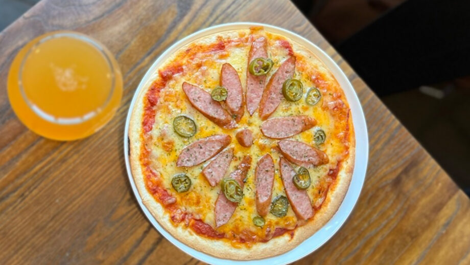 シェアしやすく、クラフトビールと相性抜群「大和豚のソーセージピザ(1,320円)」。ブランド豚の肉の旨みが濃厚なソーセージに、ピリ辛ハラペーニョ、3種のチーズなど、ビールが進む味わいです。