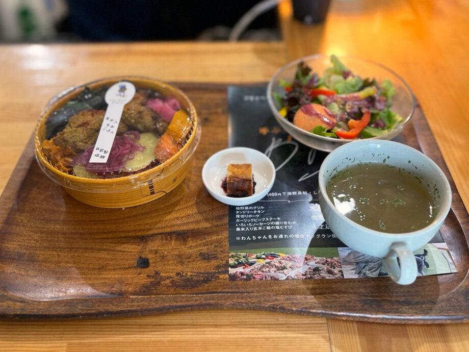 こちらでは、体に優しいスローフードをコンセプトにした4種類の手作り「わっぱ弁当」が人気。自家製塩麹に漬け込んだ鮭やポーク、チキンなど、素材の旨みを引き出したメニューが揃い、愛犬や家族と一緒にランチやカフェタイムを楽しむことができます。