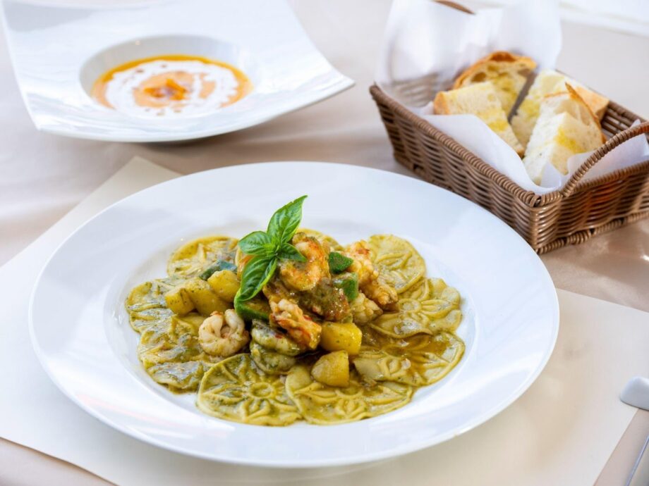 今回、メインに選んだ「コルツェッティ 赤海老&フレッシュトマトのジェノヴェーゼ」(定番パスタのランチセット2,200円〜 ・コルツェッティのセット3,300円)は、大きな丸い形のショートパスタです。