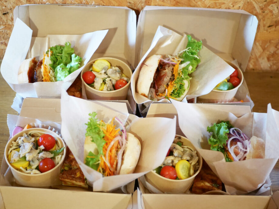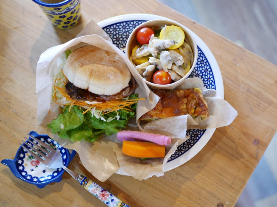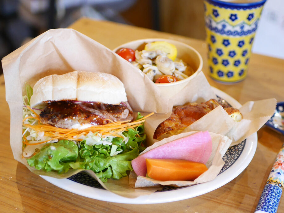 その評判から問い合わせが増え、現在の予約制「ランチボックス(1,100円税込)」が誕生。看板商品の選べるバーガーサンドに、キッシュ、パスタ、ピクルス、ふわふわのシフォンケーキまでがセットされ、自宅で“小さなカフェランチタイム”が楽しめます。