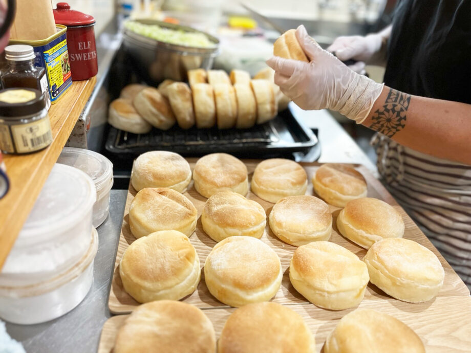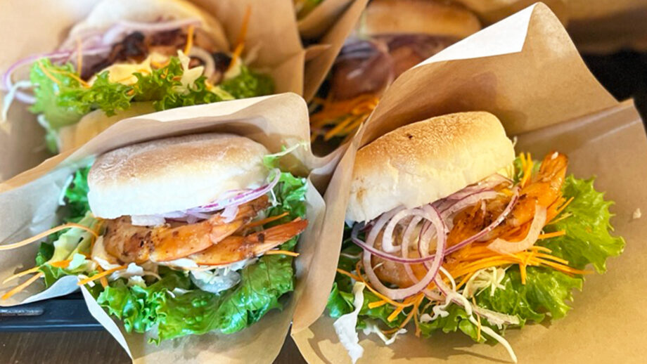 バンズは、自家製ソフトフランス。埼玉の香り高いうどん用の中力粉を、北海道産小麦と配合したこだわりの生地。もちっとした食感で、具材のハンバーグやガーリックシュリンプなどとの相性抜群です。