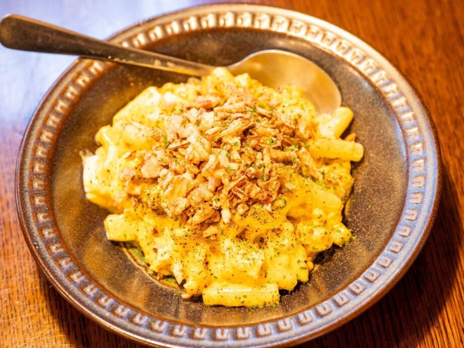 「冷めると普通なので、ぜひ温かいうちに食べてくださいね」と店主の滝澤義章さんのおすすめに従いさっそく頂きます。ゆで卵とマカロニがメインで、上にフライドオニオンチップが乗っていて、知っている味のはずなのに不思議な一品です。