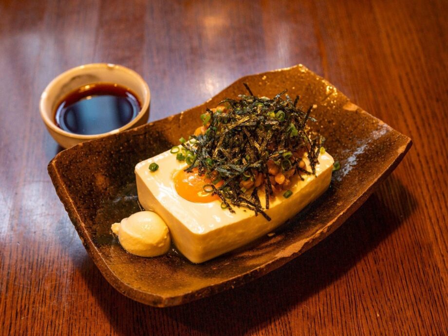 そして、一丁の豆腐に卵黄・納豆・海苔が載った「スタミナ冷や奴」は、飲酒時の栄養バランスを十分に考えられたメニューです。卵黄を乗せるために豆腐をくりぬいている見た目がチャーミングです。