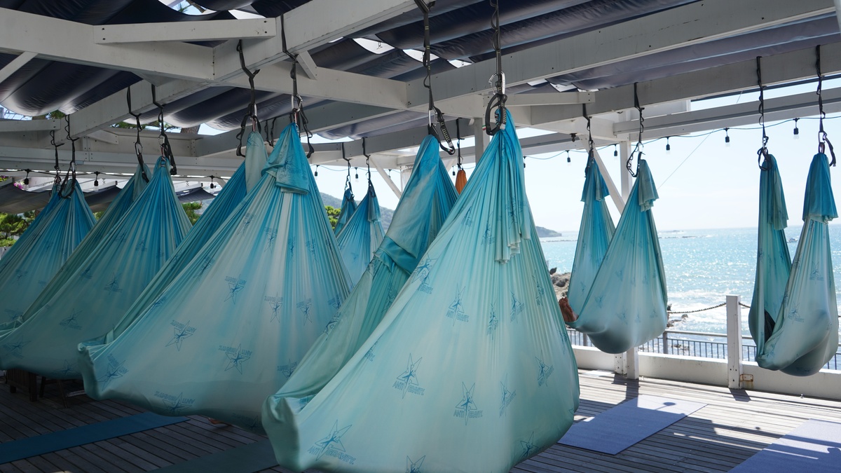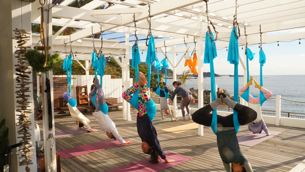 日本では他に例があまり無いアウトドアのハンモックヨガスタジオ。自然を存分に感じる事が出来る唯一無二のスタジオです。非日常の環境で思い切り身体を動かしてみては如何でしょう