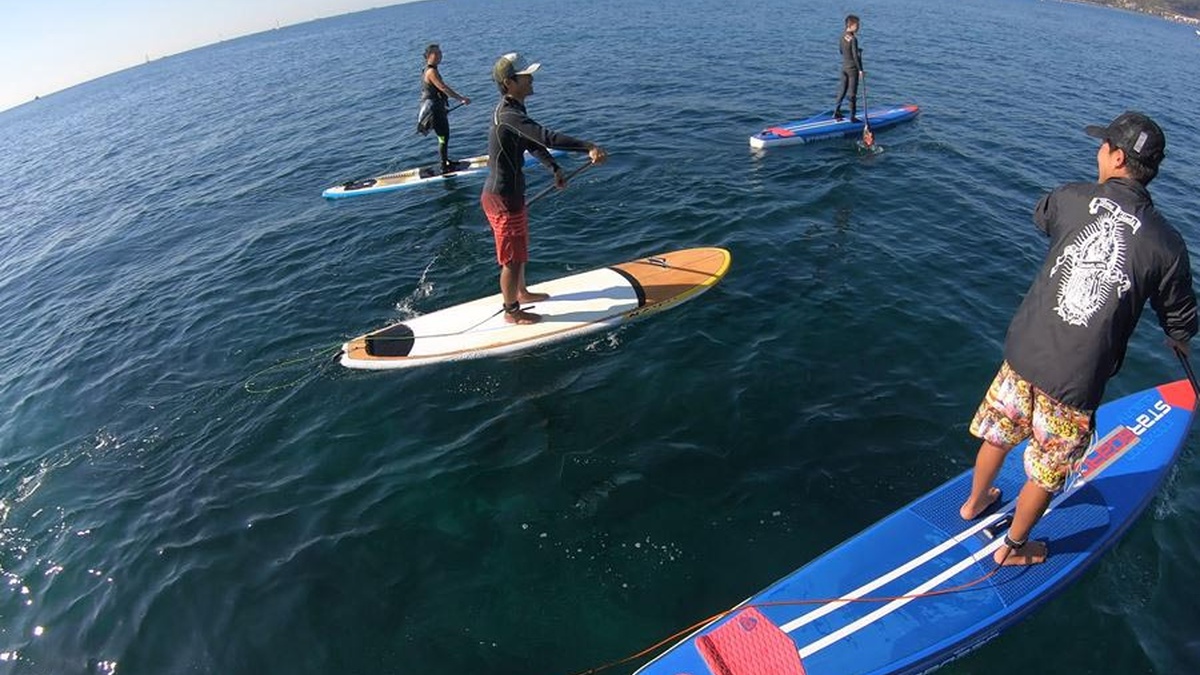 SUP半日スタンダードコース。スキルアップして思いっきり楽しみたい方へのコース。パドルワークやボードバランスなどを習得し、いろいろなコンディションで楽しみます。気象、海象なども勉強して海の知識をつけていきます。
