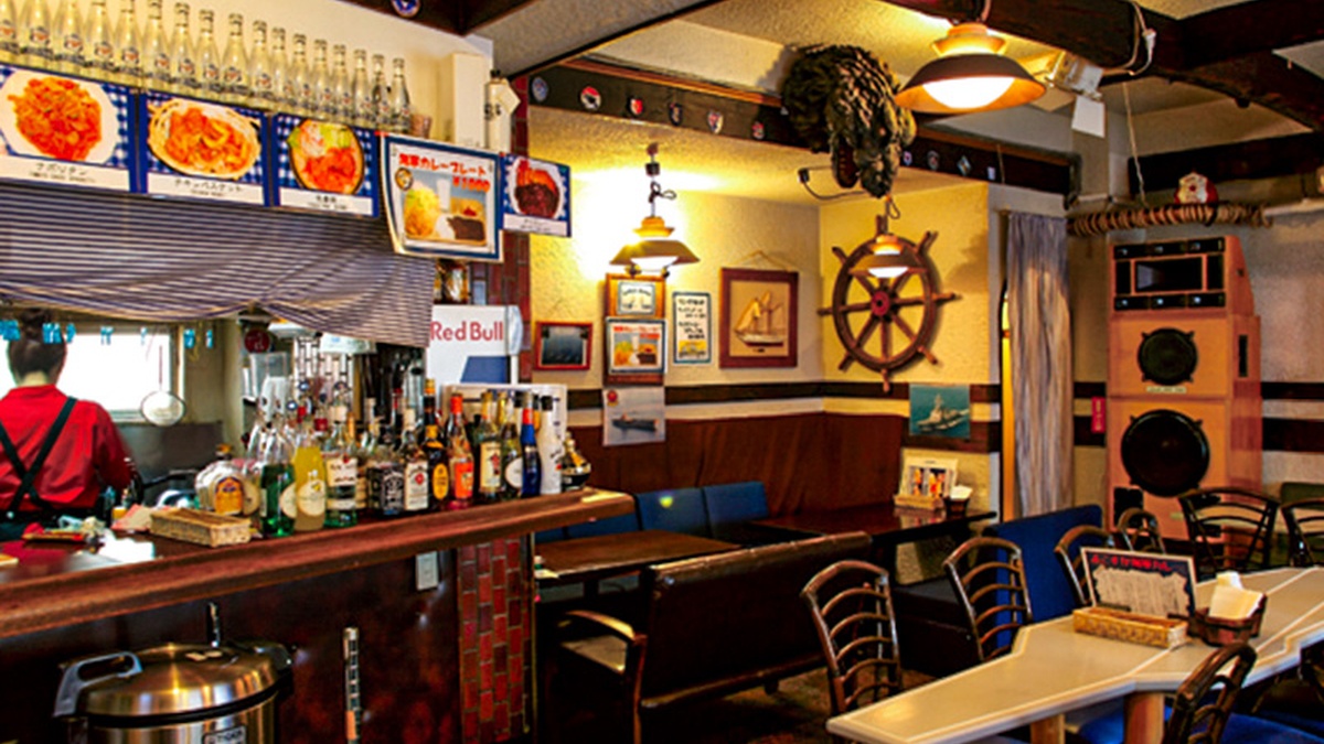 レトロな店内でいただくバーガーは、フランスパン生地のバンズでパワフルな食感。野菜を刻み、3日かけてルーから作る海軍カレーは深いコクと鶏肉の柔らかさが絶妙だ。