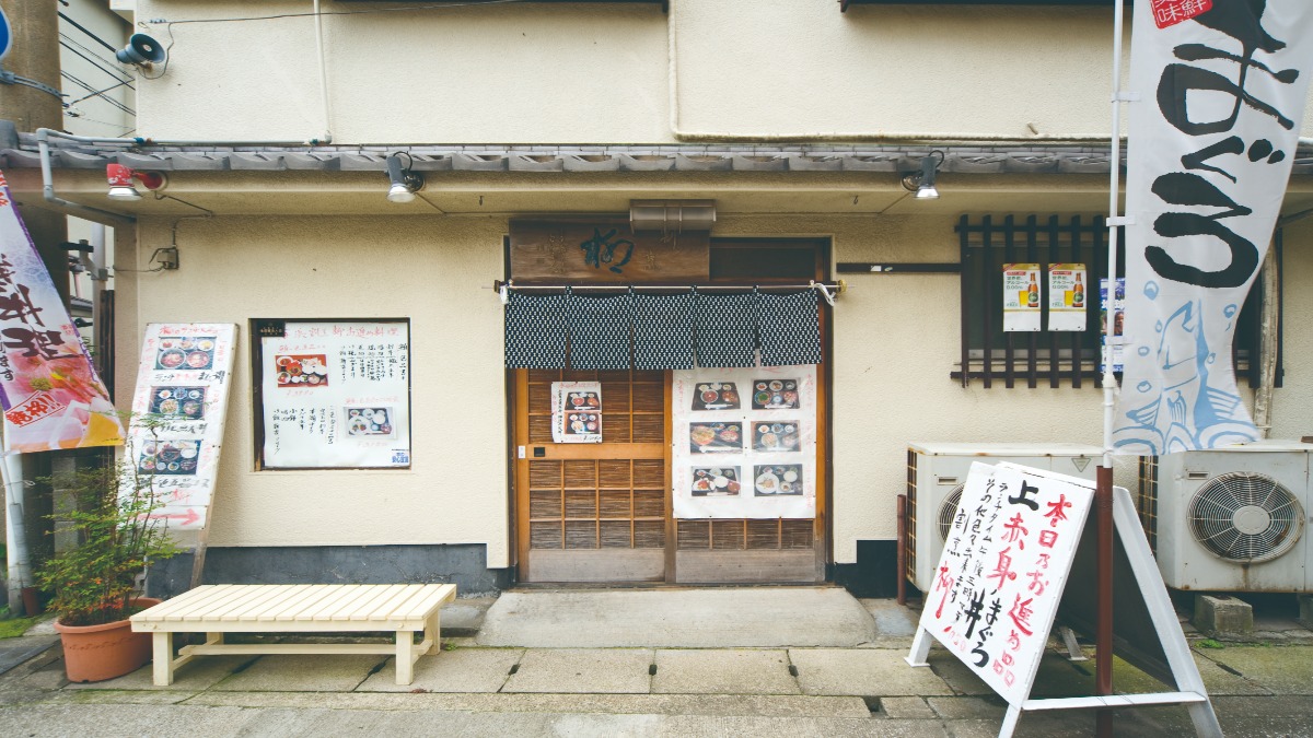 昭和27年創業の風情ある本格料亭。新鮮な赤身の刺身の他に、まぐろの骨付カマを甘辛く炊き上げ、風味づけした煮物や、まぐろ1匹から2つしか取れないハチの子(まぐろ頭身)を子供や女性の味覚に合うように甘く味付けしたくわ焼など、さまざまな部位を用いた彩り豊かなまぐろ料理が膳に並ぶ。