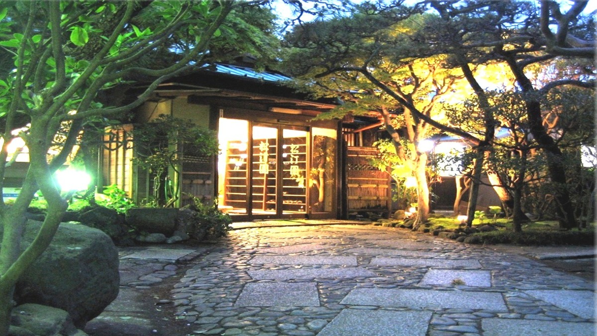 正門を進むと木々の向こうに見えてくる松汀園正面玄関