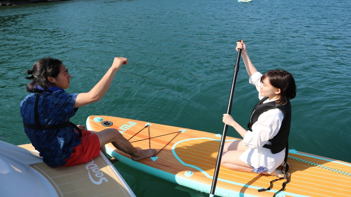船から海に出て、海水浴などのアクティビティも行えます。特に人気のSUPは、立ったままパドルを漕ぎ進めるので、まるで海上散歩をしている気分です。(SUPは無料貸し出ししております)