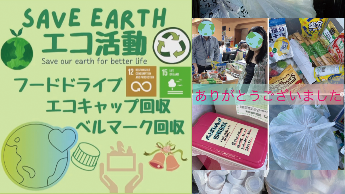 ベルマーク、エコキャップの他、家庭で使いきれない食材を持ち寄って寄付するフードバンク用食材の回収を行っています。是非お持ち寄り下さい。