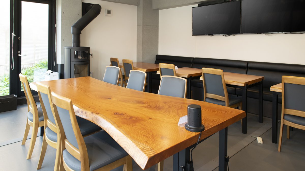 広く明るい店内では、欅の一枚板のテーブルと薪ストーブが置かれ、静かで落ち着いた空間です。