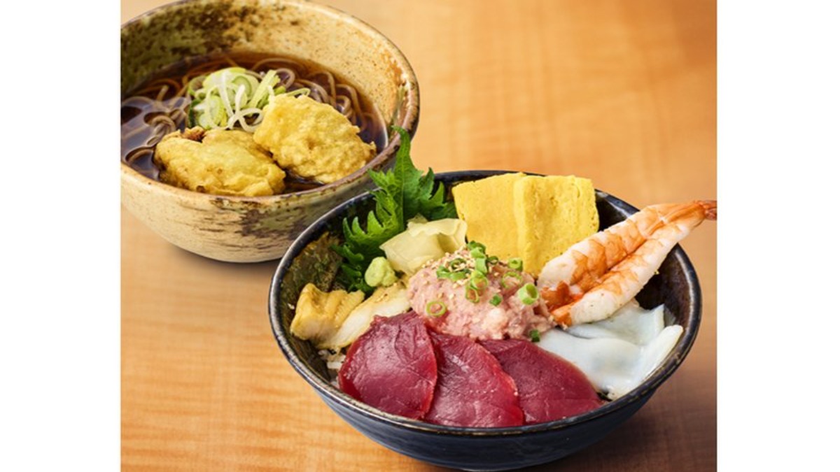 京急沿線でお馴染みの駅そば処「えきめんや」。「三崎口駅店」のみで楽しめる三崎港直送のまぐろで作った海鮮丼と一緒に提供されるのはまぐろ天(まぐろ竜田の小そば(うどん)も楽しめる。